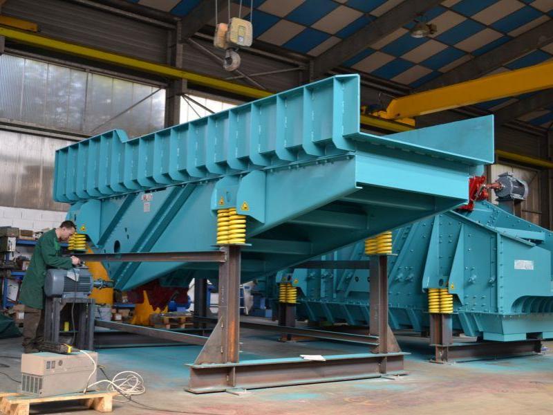 Unbalance Motors at the side or at the back depending on requirements and your layout. Different wear plates are available in S 235 JRG 2, Hardox or others. Rubber inlet against noise between trough and wear plates are available.